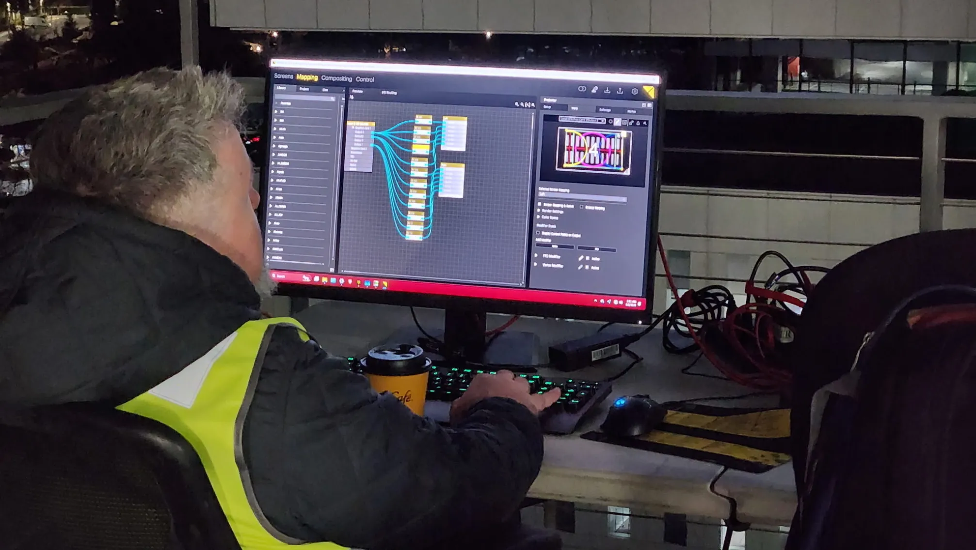 Using high-output 40,000-lumen Barco 4K projection systems, RabCup mapped dynamic visuals across more than 240 windows of the building. Custom-cut vinyl masking was applied to each window to create a unified projection surface, allowing the entire facade to function as a single visual display.